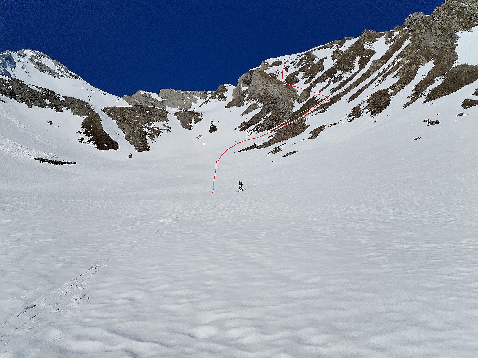 Conditions nivo et activité avalancheuse : RAS, il y a juste assez de neige, des plaques de terre présentes un peu partout en exposition sud à descente, le vallon Nord est bien rempli, la descente est raide, il faut attendre qu'elle décaille. 10h pour nous. |