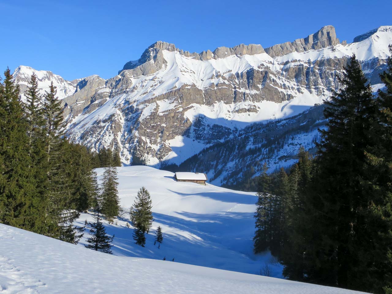 J1 Leysin – Chalet La Combe 12 km 1280 m Aller retour au Pic Famelon l’après midi pour le plaisir de la neige.