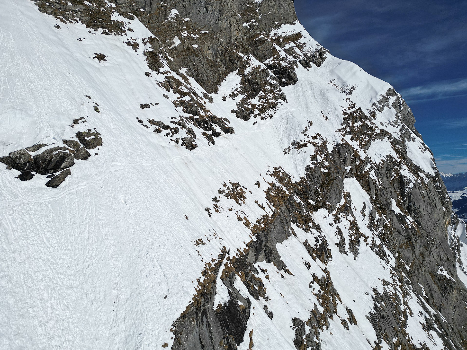 Voir photo. Descendre un des couloirs de la face, le plus simple semble être de suivre l'itinéraire "aux rêveurs", souvent en conditions sur le haut. Puis traverser la rampe. Sortir par un couloir évident.