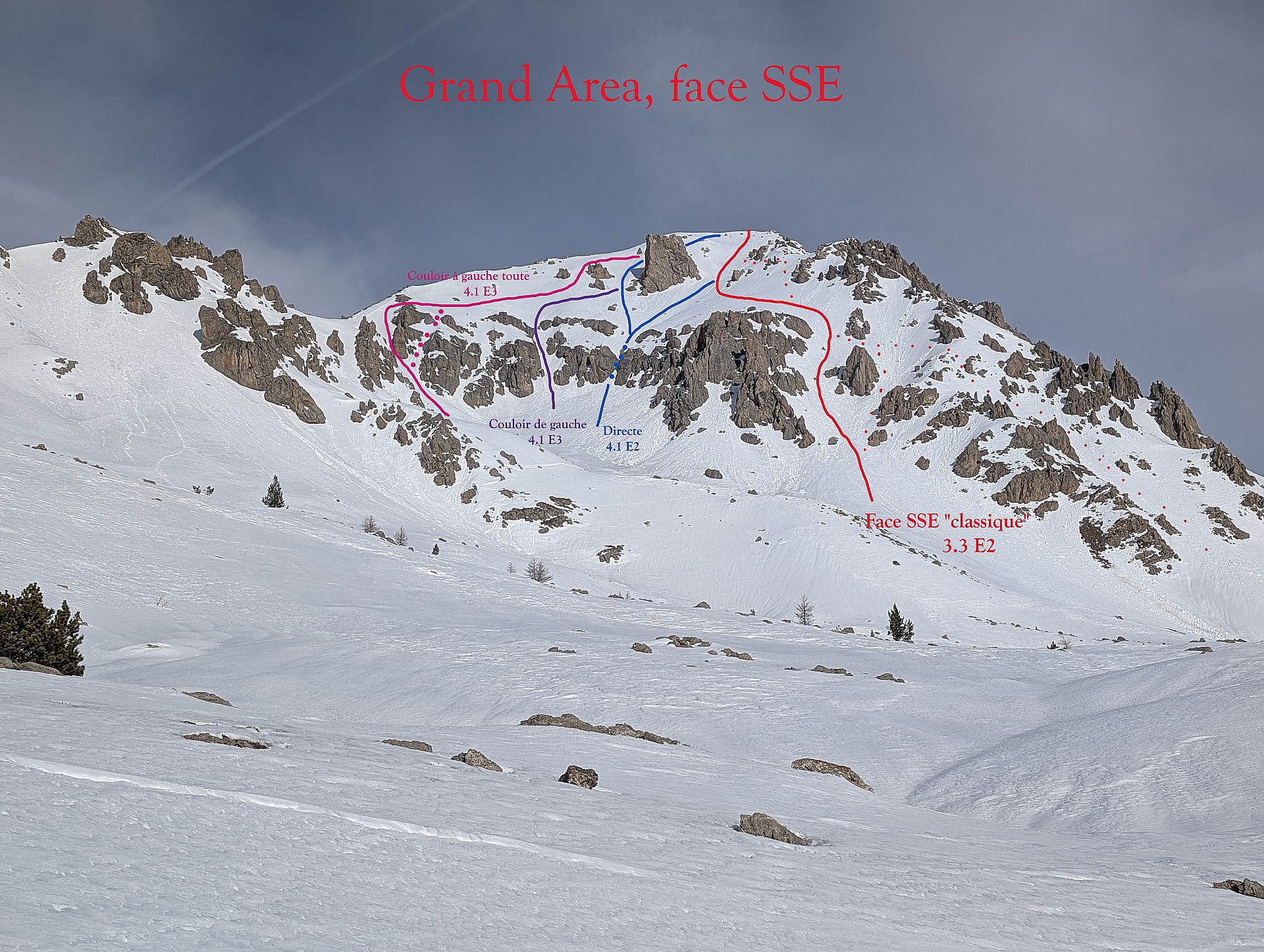 Le but est de faire 5 fois le Grand Aréa et 1 fois le Petit Aréa ! Les descentes "doivent" être différentes les unes des autres.Montée 1 - De Villard Latté monter par la route (du col du Granon) aux Tronchets (possibilité de couper quelques lacets selon l'enneigement). Continuer à suivre la route jusqu'au Pkg 2172m puis suivre le chemin de montée au Grand Area qui rejoint l'épaule Sud vers le point 2657m. Passer à l'Ouest de ce point puis remonter l'arête Sud au mieux jusqu'au sommet. Il est possible de remonter intégralement à skis soit en passant un peu dans la face SO soit par l'arête S.