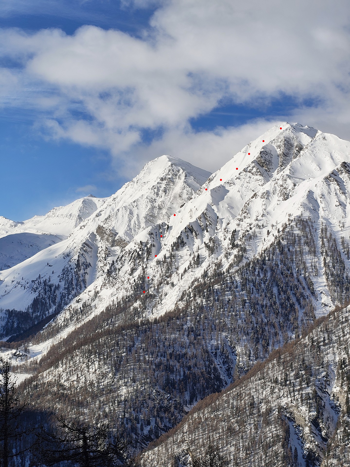 S'engager dans la face soit à gauche de l'antécime soit à droite par un petit couloir secondaire. Descendre ensuite dans l'axe sur 400m pour venir traverser à gauche vers un couloir secondaire orienté NE, au bord duquel on voit quelques petits arbres.