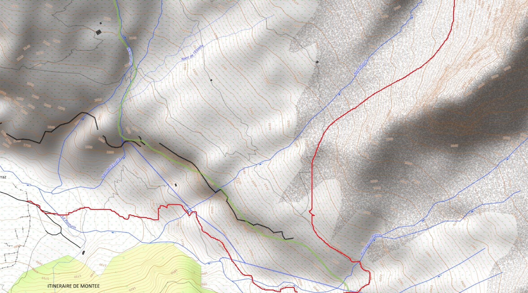 Montée : suivre la piste en direction du hameau de la Gurraz (plein Est). A ce niveau, traverser le pont pour suivre un sentier en direction des cascades de Nant Putors. Poursuivre ce sentier dont la montée devient plus raide au niveau du ruisseau du prêtre. Au niveau du GR, prendre la direction du NO, et contourner la montagne du Carro par l'Ouest. Puis monter plein Nord dans la moraine, en direction du glacier du Geay. Viser à vue un goulot d'étranglement qui tourne vers la droite en montant. Prendre pied sur le glacier et monter au mieux suivant la position des séracs, puis au droit du col des Roches, traverser plein Sud en montant, récupérer la voie normale du Mont Pourri qui se termine par l'épaule Ouest.