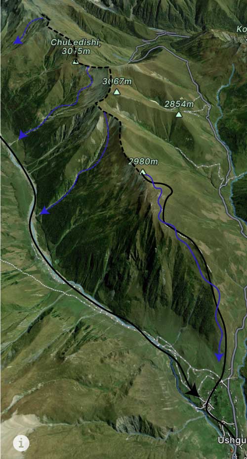 Du village partez plein Est sur la crête. L'itinéraire est évident, la montée arrive sur la crête sommitale de la chaîne de Lamaliale. Vous voyez le village d'Ushguli jusqu'au sommet.