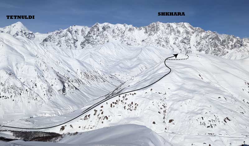- une multitude de variantes par la face nord. Attention cette descente est beaucoup plus soumise au risque d'avalanche ! Plusieurs options sont possible avec des pentes au départ autour 30-35°. La sortie de cette face se fait ensuite par l'un des nombreux goulets. C'est les pentes tout au bout de la crête qui sont les moins exposées au risque d'avalanche. Pour le retour, vous arriverez ensuite dans la vallée du Shkhara où il faudra remettre les peaux pour marcher jusqu'au village d'Ushguli.