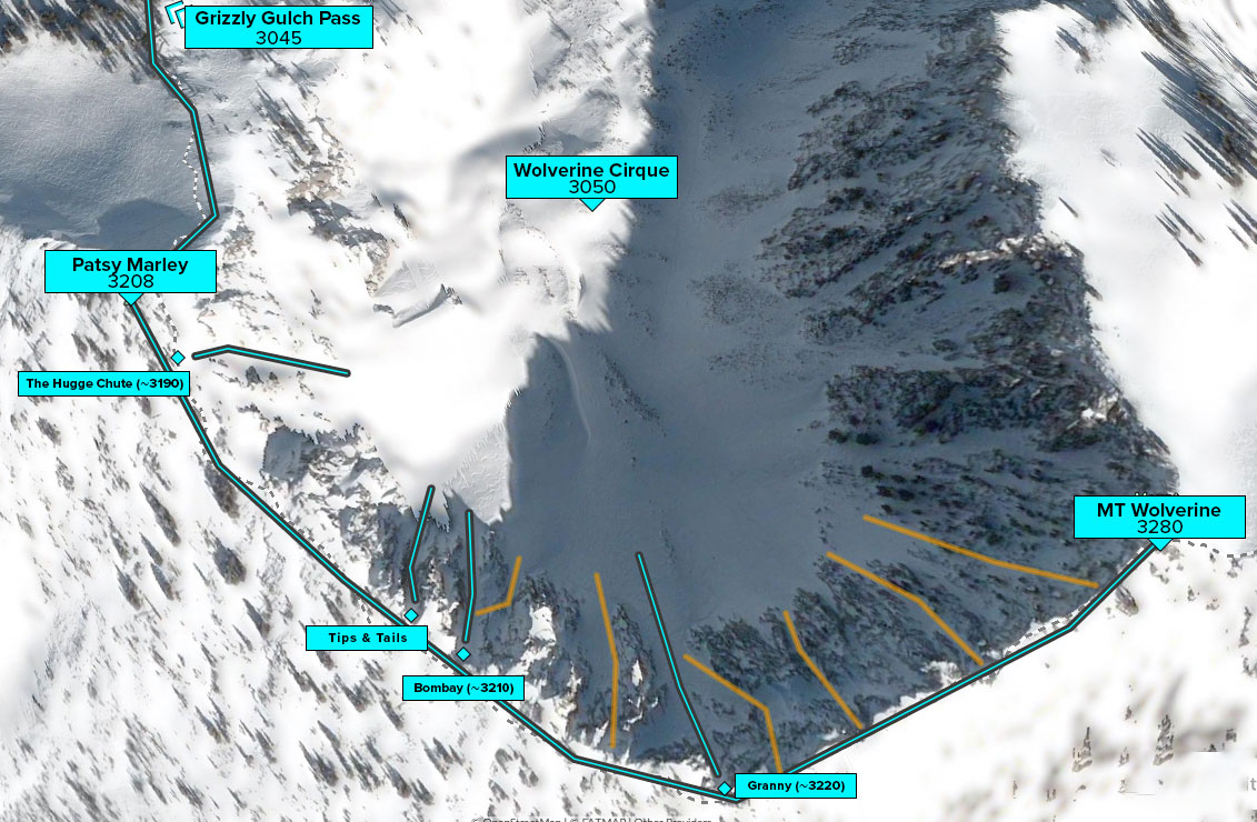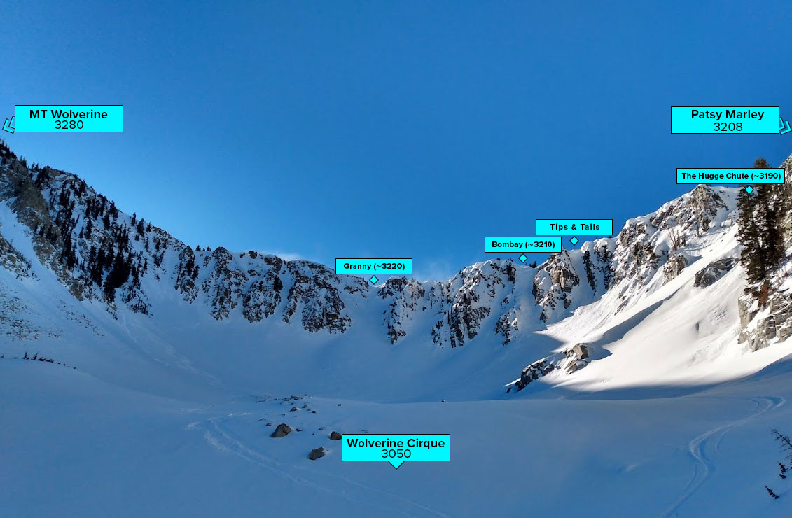 Un petit Cirque percé d'une multitude de couloirs. Facile d'accès par Grizzly Gulch, il offre une multitude d'options gardant la neige fraîche pendant de longues semaines. Sortie ultra efficace, parfaite pour commencer la pente raide.Orienté globalement NNE, les couloirs ne prennent pas beaucoup le soleil, mais sont souvent soumis au vent, ce qui donne parfois des entrées cornichées, ou seches.