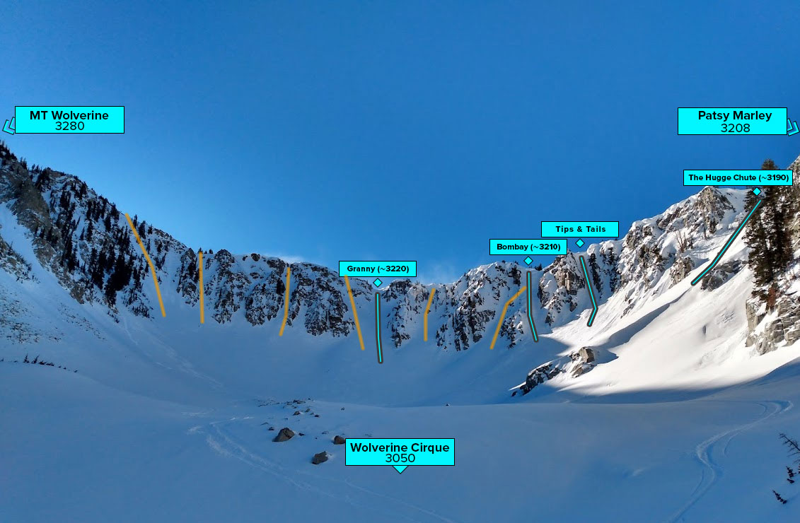 -The Huge Chute. Comme son nom ne l'indique pas, c'est sans doute l'un des couloirs les plus tranquilles du cirque. En suivant le fil du couloir, vous aurez une pente régulière légèrement sous le 40° (4.1, 150m). Possibilité de trouver des contres pentes N autour de 45+ sur quelques dizaines de m. Il est très large, de la place pour faire les virages, l'ambiance est cool sans être extrême. C'est le seul couloir de cette partie du cirque qui est orienté plutôt E, il voit ainsi un peu plus le soleil que ses voisins.