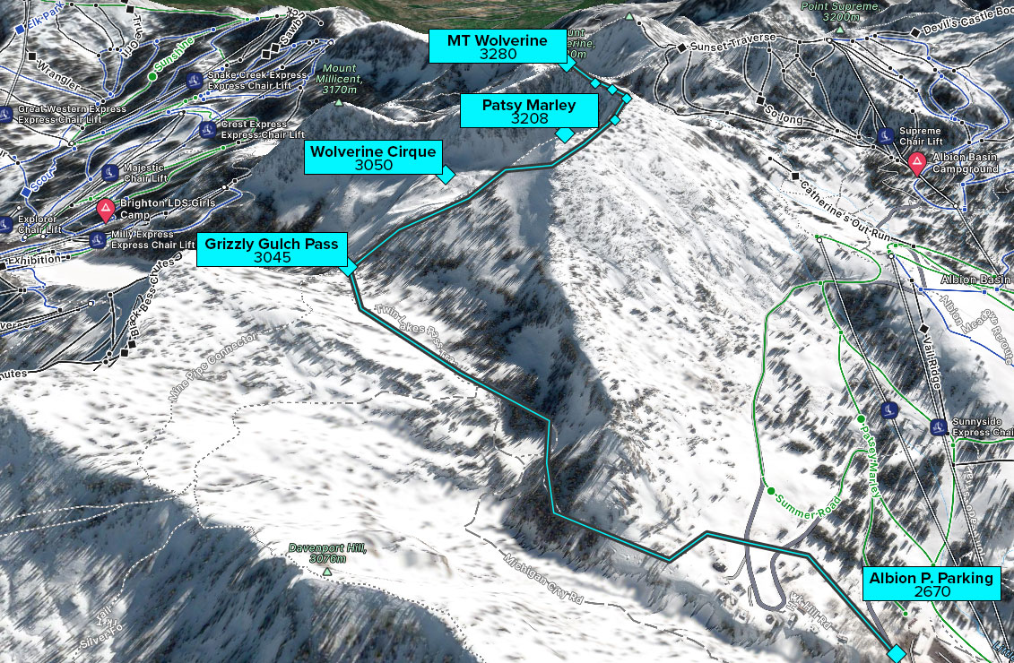 Suivre la montée classique vers le col du Grizzly Gulch :Passer devant le check DVA du parking, monter +/- le long de la route d'été qui est damé l'hiver pour les lodges au dessus. monter à côté des lodges puis suivre la ligne électrique qui remonte le Grizzly Gulch.