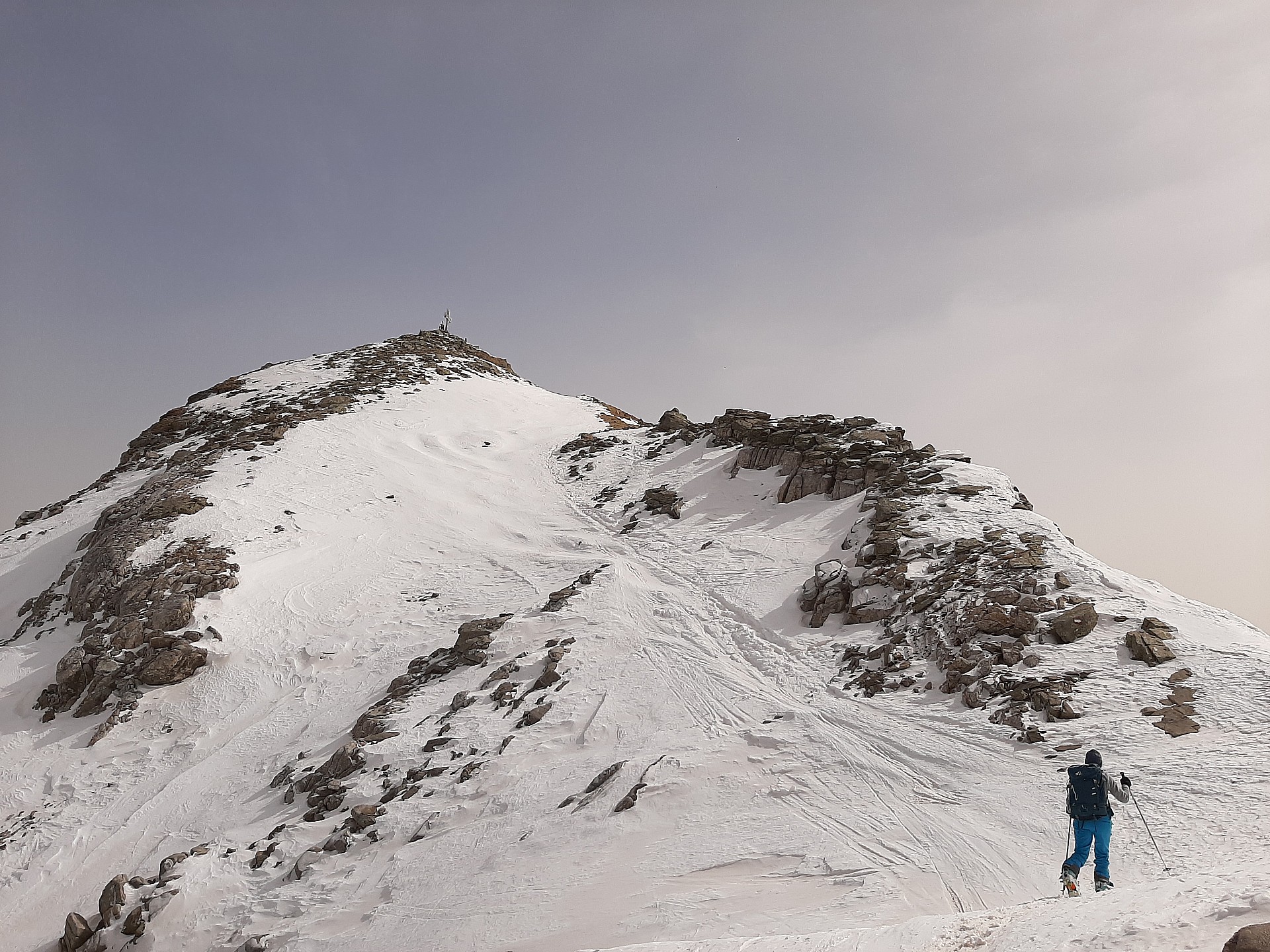 Prendre la piste en direction d'enregistrement Alm. Ne pas traverser le pont mais monter progressivement en rive gauche, jusqu'à atteindre le haut du vallon. Il est entaillé par 2 gorges que vous évitez en passant soit à droite soit à gauche, poursuivre au mieux vers le sus-est vers un sommet possédant une falaise noire. Il faut passer une brèche sur la crête de gauche ( repérer un rocher en forme de tour noire). La brèche est à sa gauche. Traverser vers l'est puis remonter encore vers un col d'où l'on découvre enfin le sommet. Descendre un peu, puis traverser et remonter au sommet bien visible.Matériel :