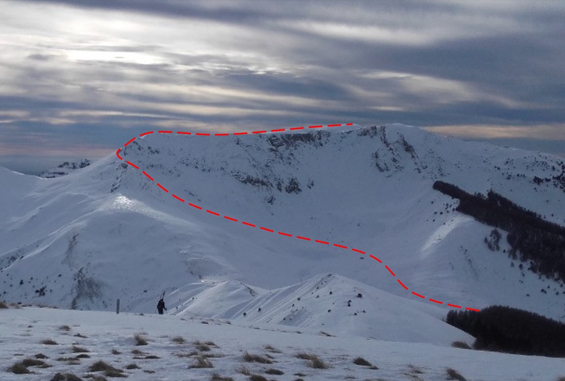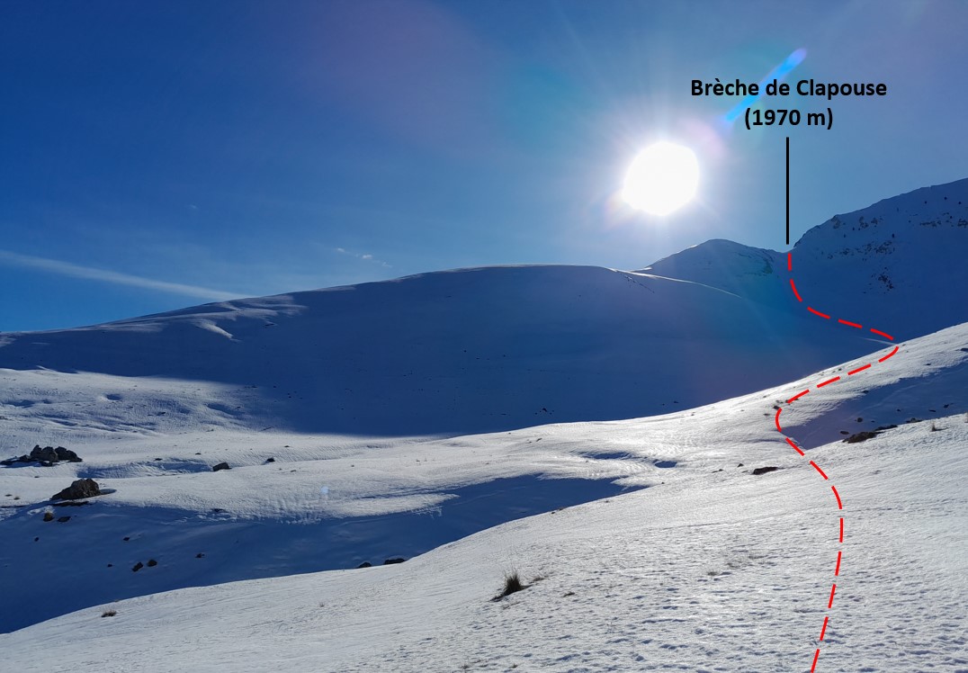 Esparron-la-Bâtie (1200) - Gué point 1352 (possible deuxième parking) - Communaresse (soit par la piste, soit par les prairies du ravin des Goures) - Pâturage de Clapouse (par la piste du Grand Bois) - Cabane de Clapouse - Brèche de Clapouse (1970 m) - Arête SE des Monges - Sommet (2115 m)Possibilité de descente par le même itinéraire, soit par le couloir E (4.1) soit par les Gorges du Pradon